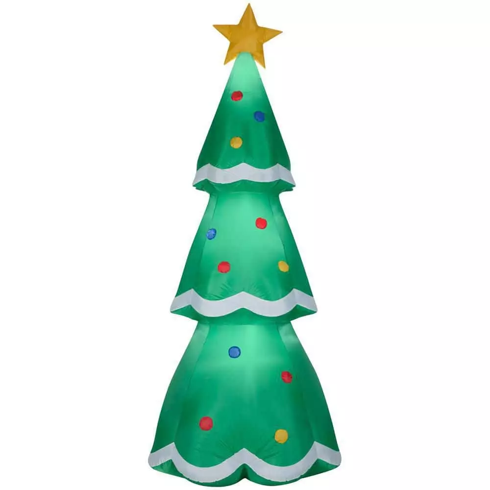 Deck the yard with a giant Airblown Inflatable Christmas tree. Featuring colorful ornaments and 3 snowy layers, this Christmas tree inflatable makes an eye-catching addition to your outdoor holiday decorations. Setup is super simple. Just plug it in, stake it down and watch the magic unfold. Display this impressive inflatable as a standalone or combine it with other Airblown characters to create a custom scene. Includes everything needed for easy outdoor setup.