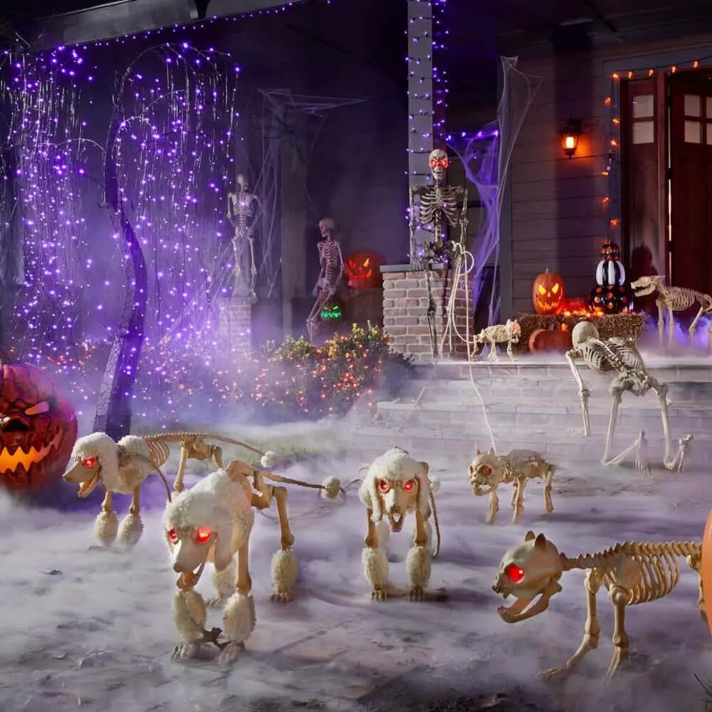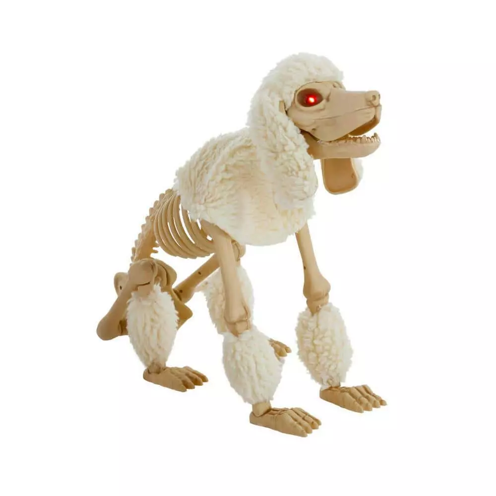 Herd in the Halloween season with this poseable animated sitting skeleton poodle. The red LED eyes give off a ghoulish glow into the night, while chilling growling and barking sounds elicit screams and shouts. A sound sensor gets the scares started, and a versatile, battery-powered design supports plenty of placement options indoors or on your porch. With realistic bone details and hair material accents, this poseable animated sitting skeleton poodle lets you set a spooky scene.