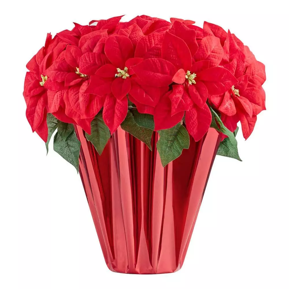 Perk up your holiday decor with this artificial poinsettia floral arrangement. The generous size stands out as a centerpiece or accents your table decor. Eleven polyester silk blooms create a full, realistic appearance for a lively look without the need for water or sun, while the foil-wrapped base offers effortless indoor placement on a desk, shelf or table. Featuring vibrant red hues, this artificial poinsettia floral arrangement helps make your yuletide merry and bright.