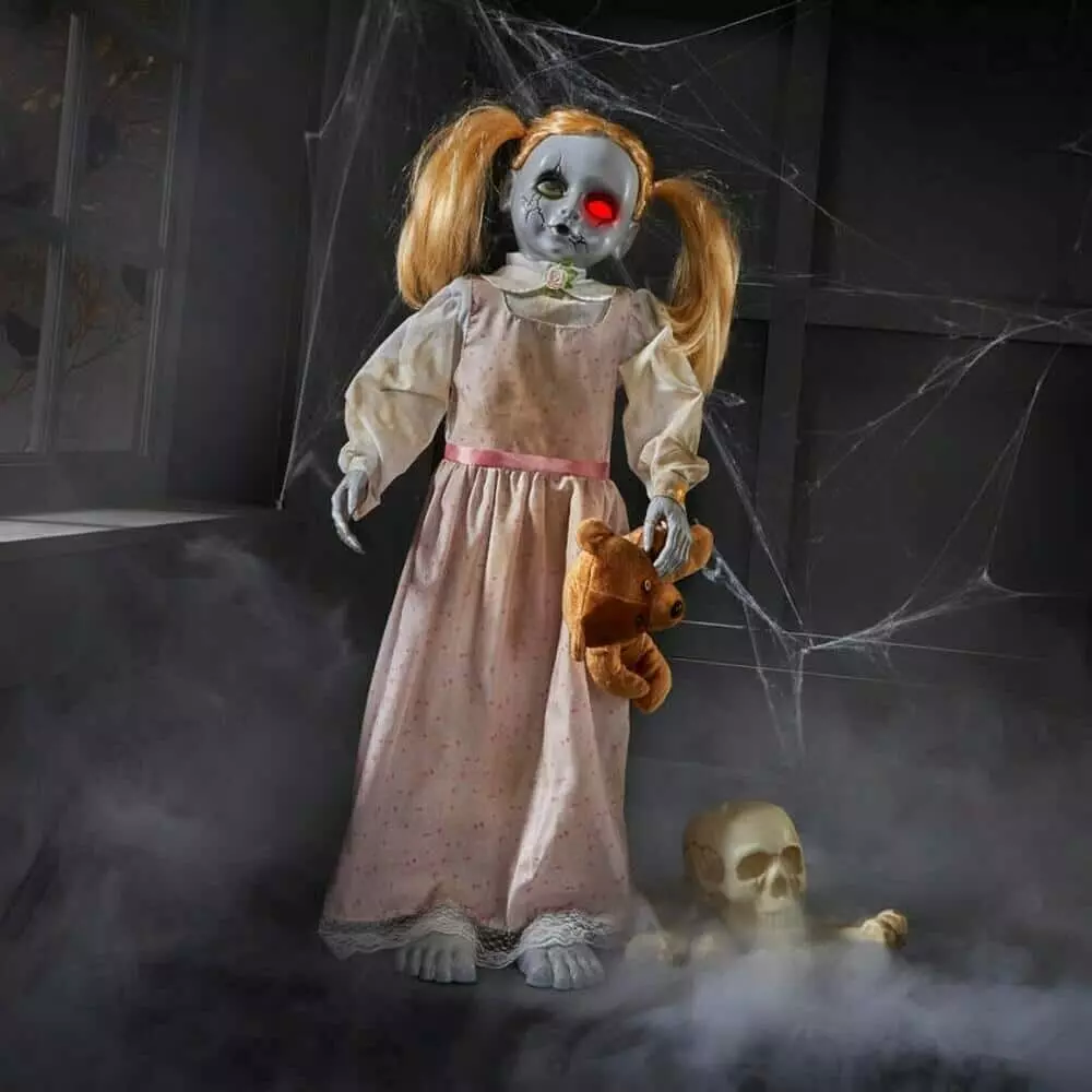 Set up a fun and shriek-worthy Halloween display with this 3-foot animated LED haunted doll. With a tattered teddy bear in her hand, this figure sports a well-groomed blonde hair and neat pink dress that stand in stark contrast with her glowing red eyes. Bright red LEDs help the eyes stand out, heightening a creepy ambience. Her head and hands move in sync with the spine-tingling sound recording to entertain and spook your guests. This battery-powered animated LED haunted doll features sound sensor activation for goosebump-inducing Halloween pranks.