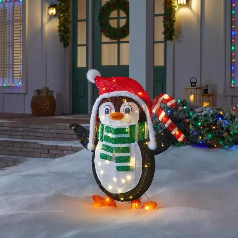 Welcome the most wonderful time of the year with this tinsel LED cute penguin. The red Santa hat, green winter scarf and red candy cane provide colorful, eye-catching additions to your cheery Christmas yard decor. Warm white LEDs cast a festive glow, while the included stakes and stand enable a quick, secure outdoor installation. At 36 inches high, this tinsel LED cute penguin pairs well with your Santa Claus, reindeer and snowman figures for a fun custom scene.