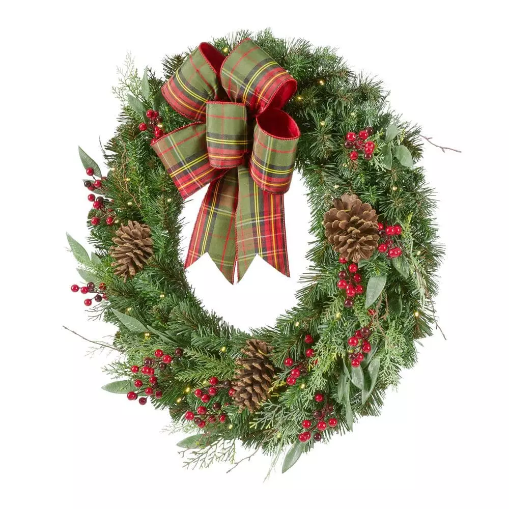 - Pre-lit mixed-pine wreath brings seasonal spirit