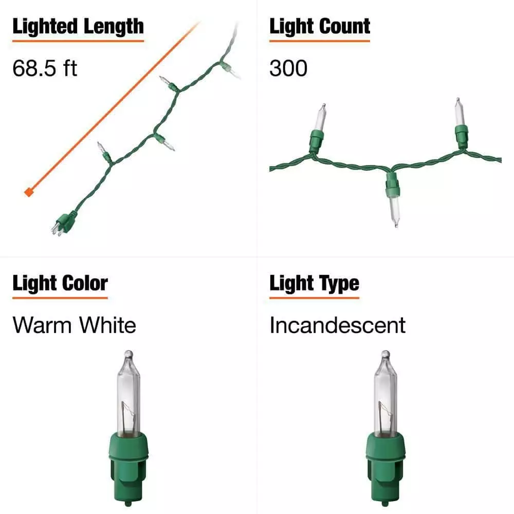 Welcome Christmas party guests warmly with this Home Accents Holiday white mini incandescent light string.The bulbs keep on shining bright even if one bulb burns out. The 300 mini incandescent lights deliver radiant illumination, while the generous 68.5-foot lighted length lets you decorate outdoor gathering spaces, rooflines or fences. Use the spare bulbs to quickly replace bad ones and keep the party going. Compliant with UL safety standards, this Home Accents Holiday white mini incandescent light string lets you enjoy a fun and festive season.