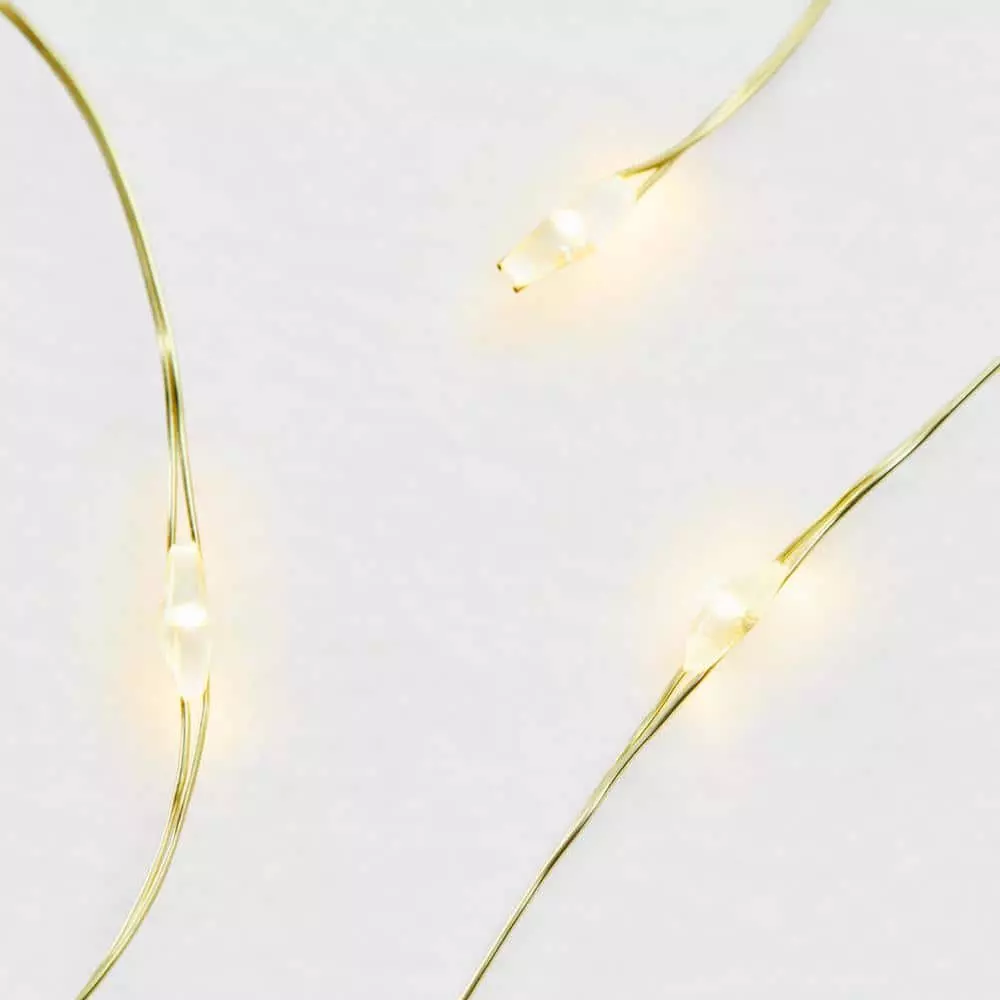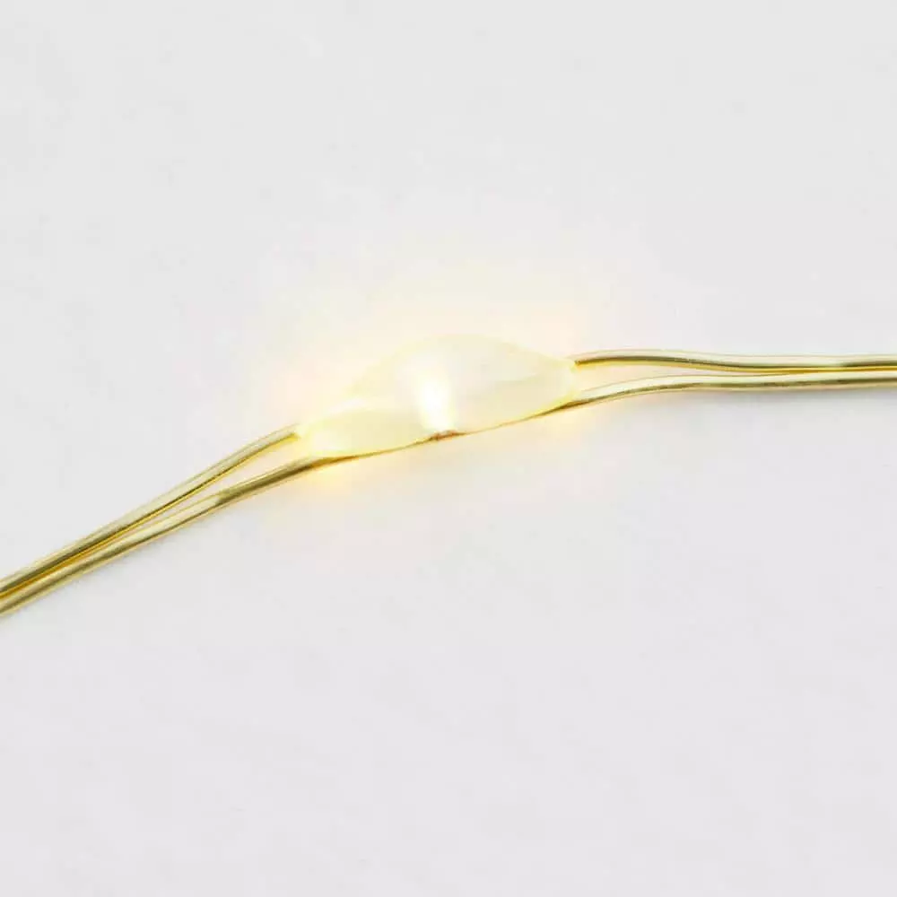 Usher in the brightest and happiest season of all with this 9 ft. 36-light gold micro dot LED string. The 36 pre-strung warm white lights deliver a cozy and festive glow, transforming the ambience in your living room. An ultra-slim golden wire enhances a luxurious holiday display, while an inline timer lets you easily automate on/off functions. Featuring a battery-operated design, this 36-light gold micro dot LED string allows for cord-free placement along the banister, mantelpiece or windowsill.