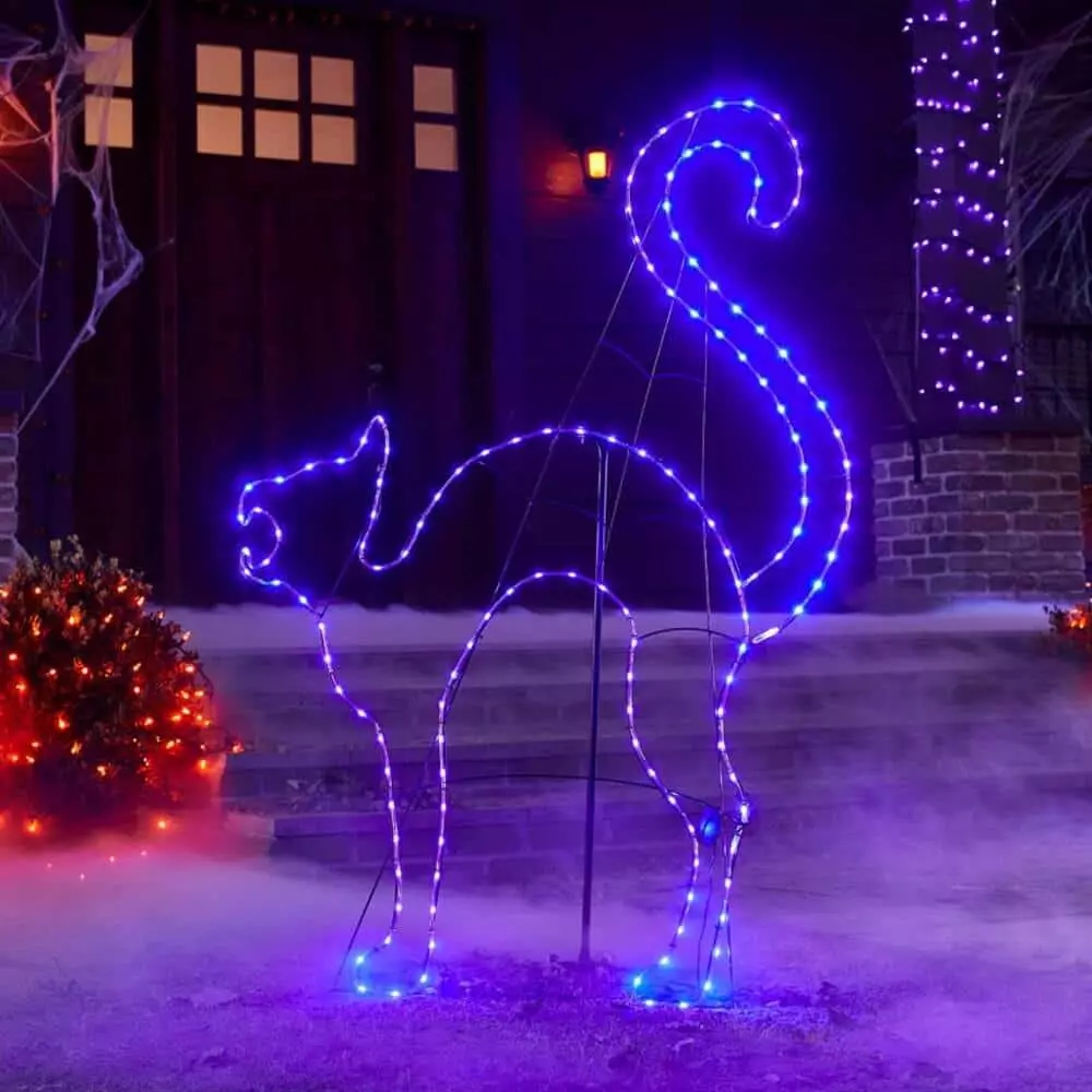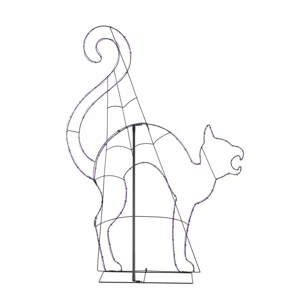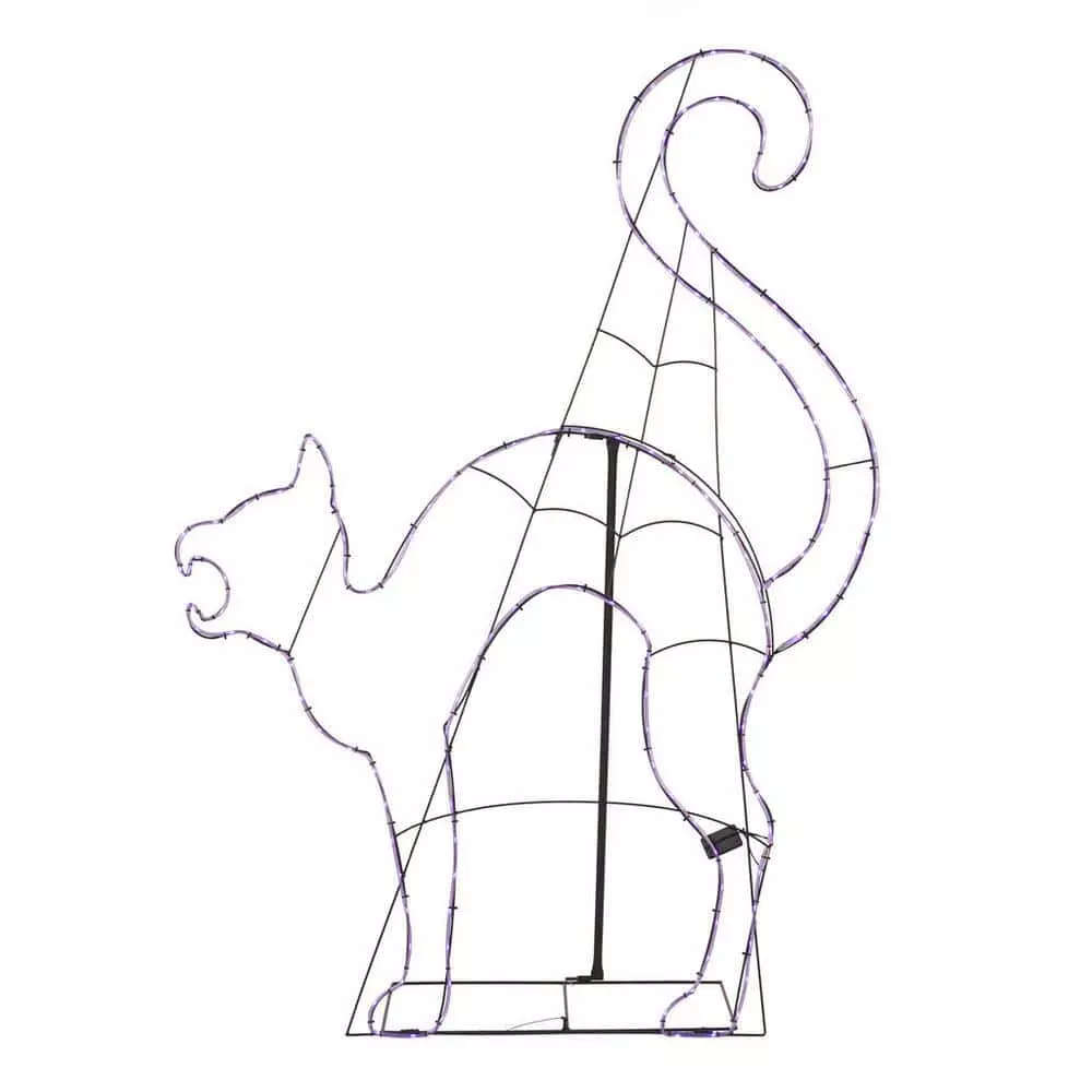 Deck out your yard for the spooky season with this Halloween light-up black cat silhouette yard sculpture. Purple lights emit a gruesome glow to set an eerie atmosphere. A weather-resistant cover and reliable metal frame offer lasting use throughout the season, while included stakes keep your tableau firmly in place. Standing 54 inches tall, this Halloween light-up black cat silhouette yard sculpture creates an imposing centerpiece for your front lawn display.