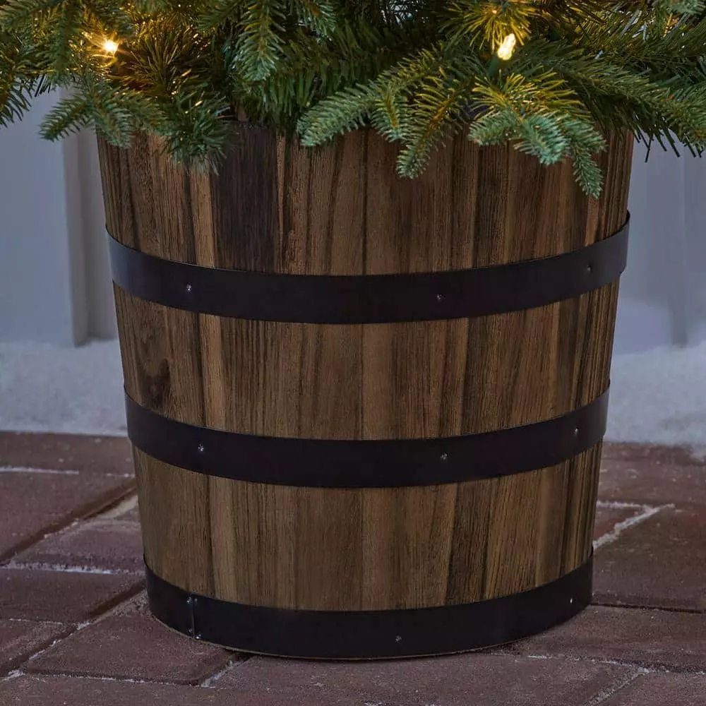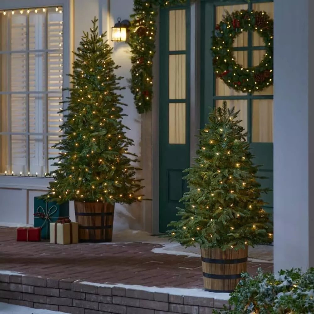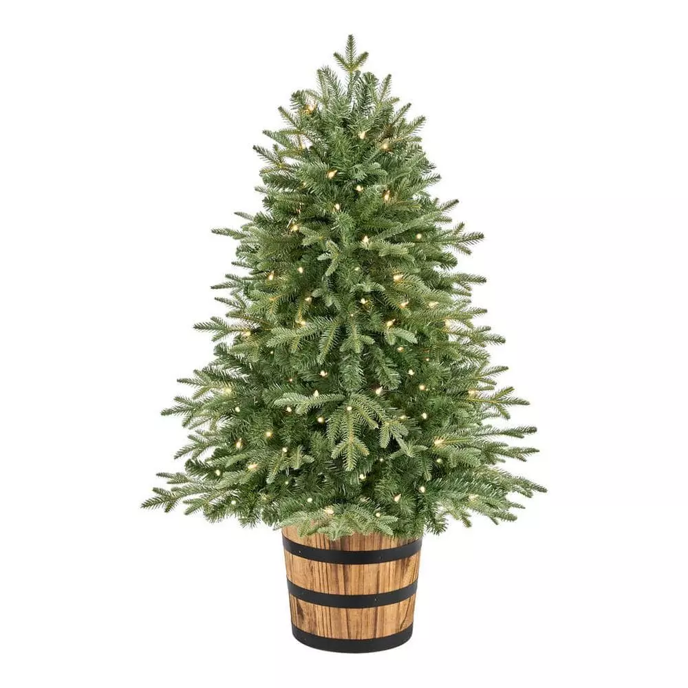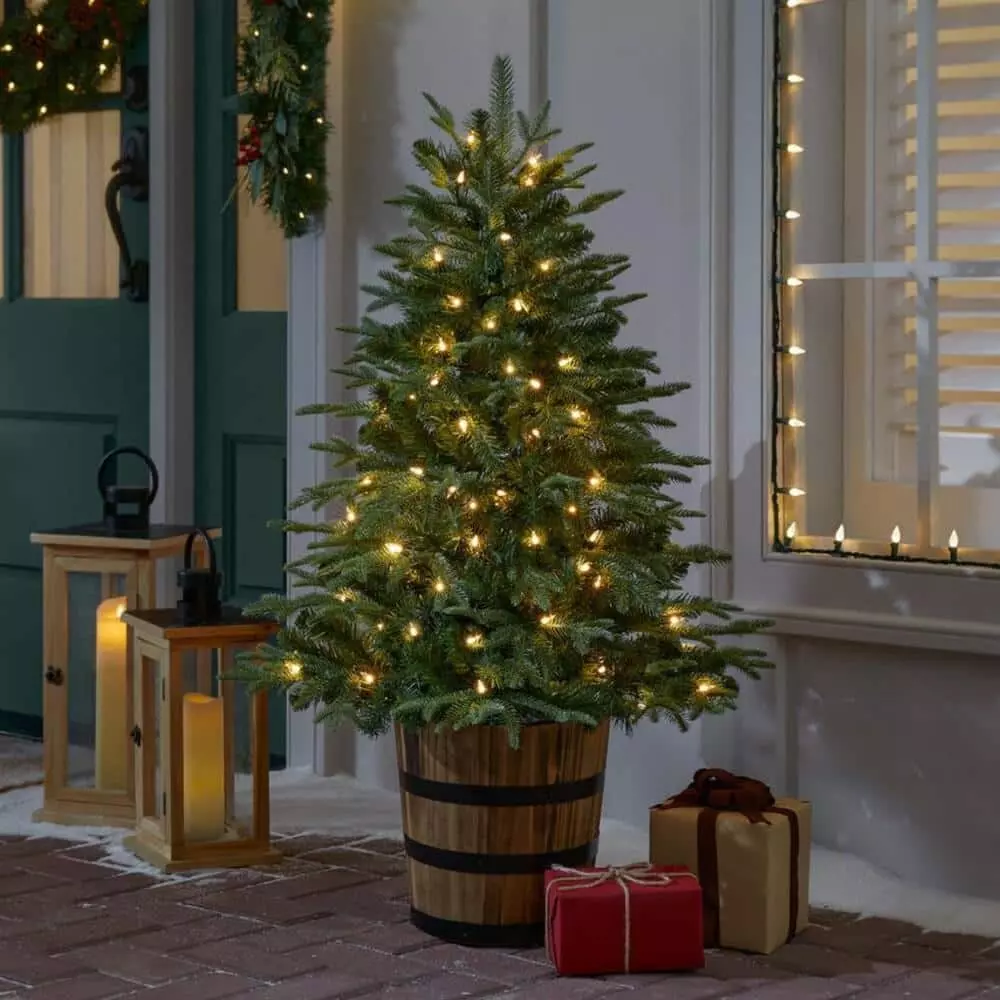 Go for a classic, elegant look with this 4-foot Fraser fir pre-lit incandescent artificial Christmas tree. The abundant green foliage features 558 branch tips that are ready for decorating with your favorite ornaments. Pre-wired with 70 warm white clear lights, this artificial fir tree gives your home a lively glow. Incandescent lighting delivers bright illumination, while the wooden barrel pot adds visual flair and offers stability. Suitable for covered outdoor areas, this Fraser fir pre-lit incandescent artificial Christmas tree lets you dress up your porch, hallway or veranda.