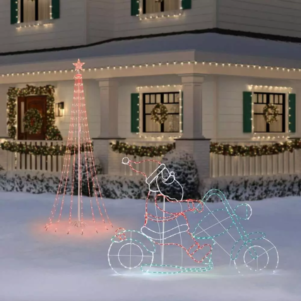 Charm your guests with this 48-inch wire tube Santa Claus in motorcycle light-up silhouette. Father Christmas exchanges his sleigh for a motorbike to give your holiday display a quirky twist. A sturdy metal frame and acrylic construction ensure durability, while the array of 415 cool multicolor LEDs keeps your home sparkling throughout the season. Secure your outdoor installation with the included stake and stand. This wire tube Santa Claus in motorcycle light-up silhouette suits indoor and outdoor areas, allowing for flexible placement on your porch or dining room.