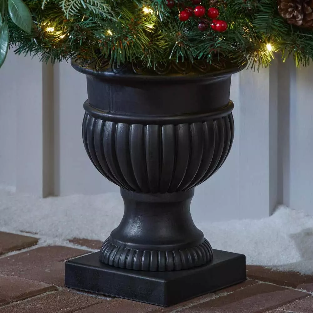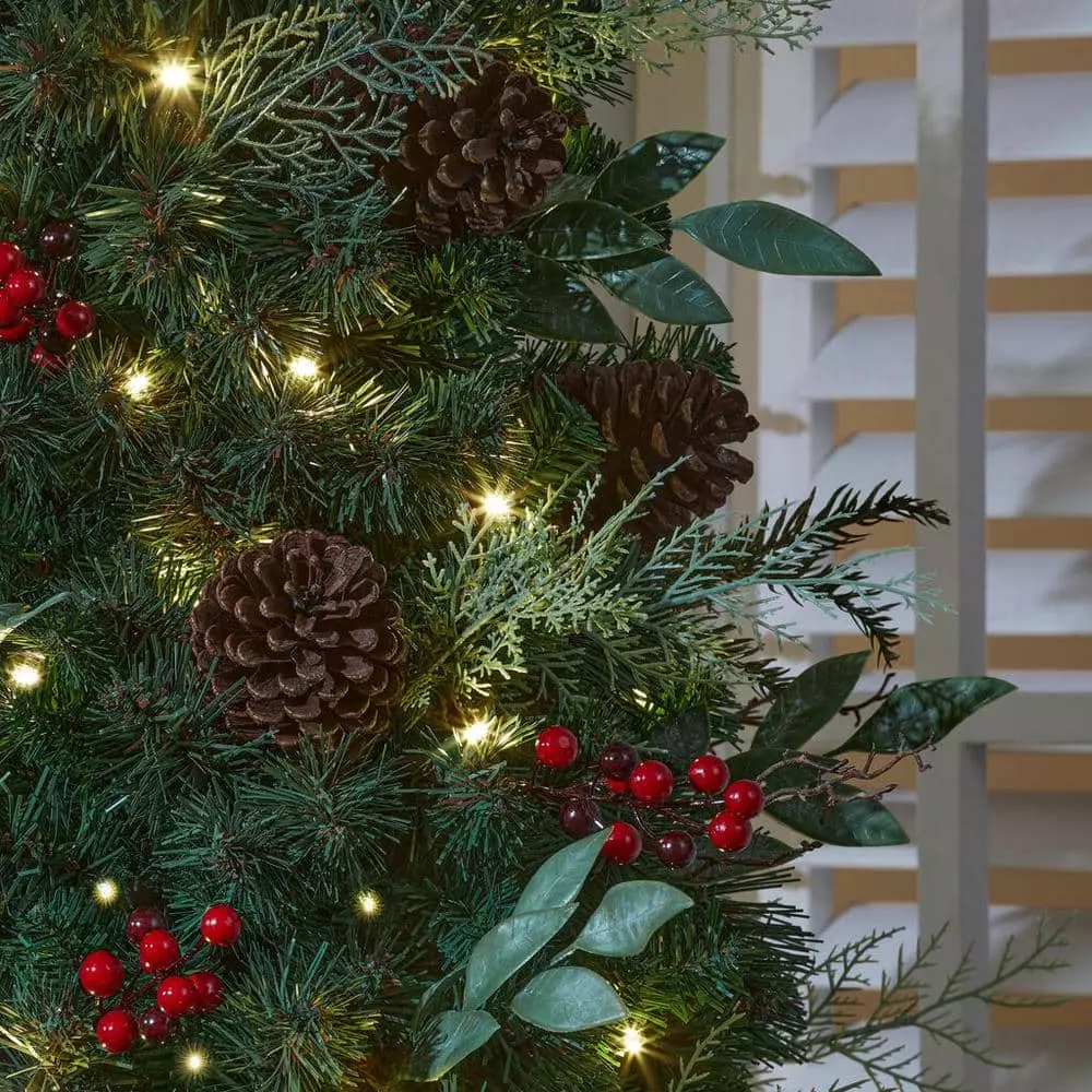 Accent your holiday decor with this set of two Woodmore pre-lit artificial Christmas trees. Decorative black pots eliminate the need for tree skirts and stands, creating an instant decoration for your home. Pine cones and red berries deliver a classic look, while the red bows add a festive finishing touch. This pair makes a perfect addition to a front foyer or covered porch, creating a warm, welcoming vibe for seasonal celebrations. With 70 warm white lights on each piece, these Woodmore pre-lit artificial Christmas trees twinkle through the night.