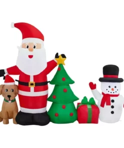 Add a festive touch to your yuletide decor with this Airblown Santa and snowman inflatable scene. Featuring St. Nicholas holding a puppy, a snowman, gift box and Christmas tree, this delightful accent promises a season of fun and gift-giving, and energy-efficient LEDs emit a sparkly, cheerful glow to set a festive mood for your celebrations. This Airblown Santa and snowman inflatable scene is simple to set up with a self-inflating design, and the included stakes and tethers keep it firm in case of harsh weather.