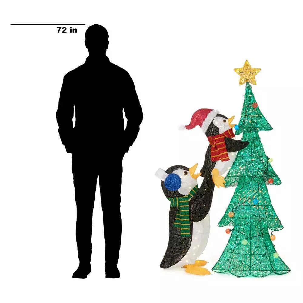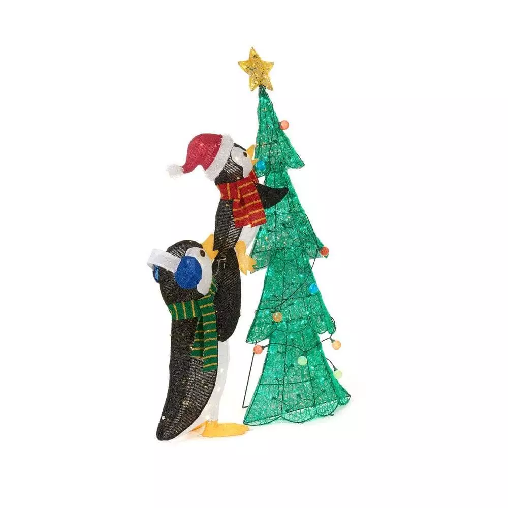 Create an adorable, winter-themed scene in your front yard with this Home Accents Holiday LED penguins with tree sculpture. A sturdy wire frame stands up to season-long use in outdoor areas, and the 160 white LEDs illuminate the spun acrylic and tinsel fabric to deliver a glittering display. The included metal stakes help secure the installation against wind. This Home Accents Holiday LED penguins with tree sculpture features a pair of cute penguins rocking festive scarves, showing your neighbors how to brave the elements in dashing style.
