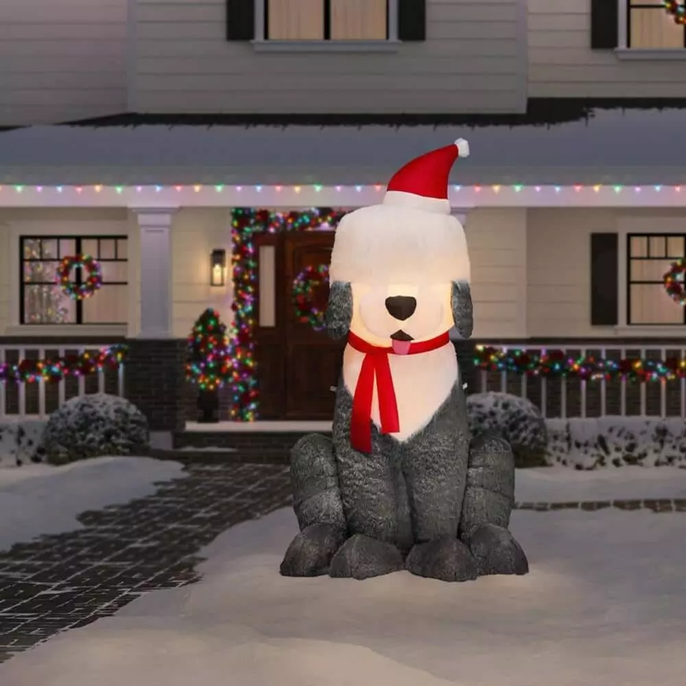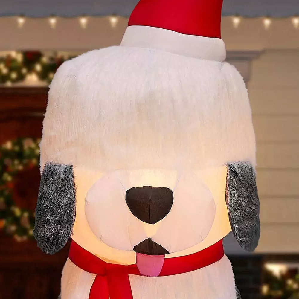 Perfect a paw-tastic holiday scene with this 7-foot Airblown sheepdog inflatable. Plush, fuzzy accents a snuggle-worthy touch to this happy pup, and the whimsical figure features a Santa hat and matching red scarf for an adorable finishing touch. Energy-efficient LEDs add a brilliant glow to light up your lawn or patio. This Airblown sheepdog inflatable boasts a self-inflating design for quick setup and comes with ground stakes and tethers for secure placement in your winter display.