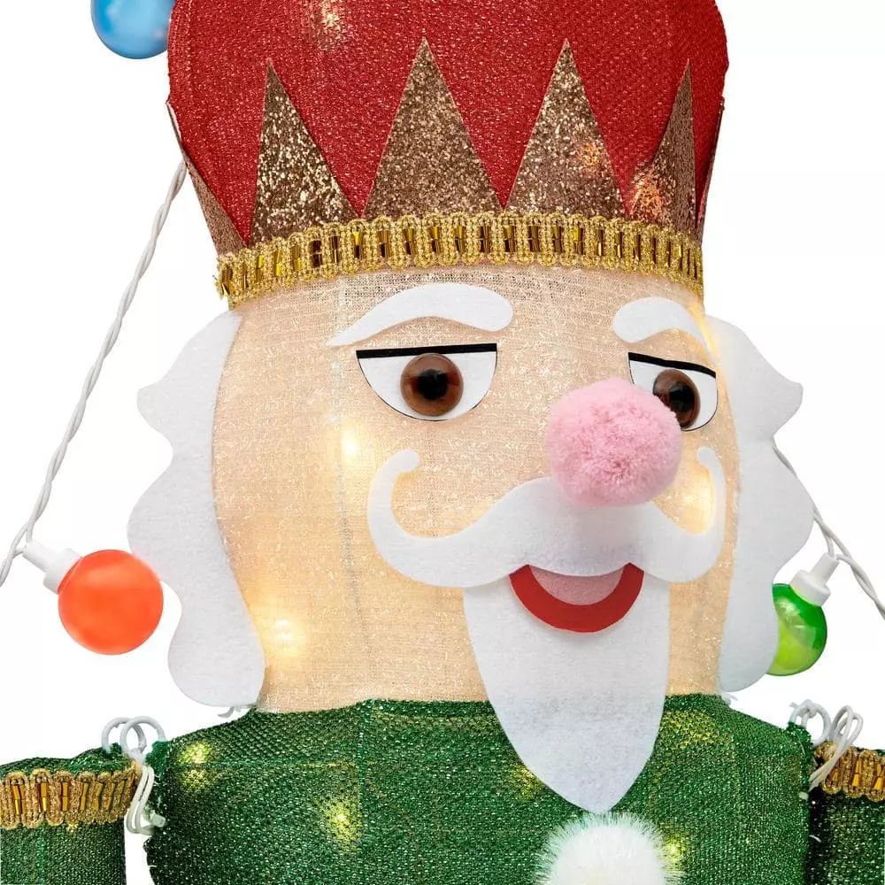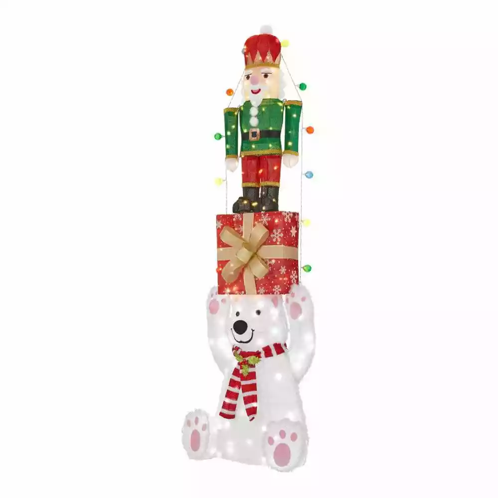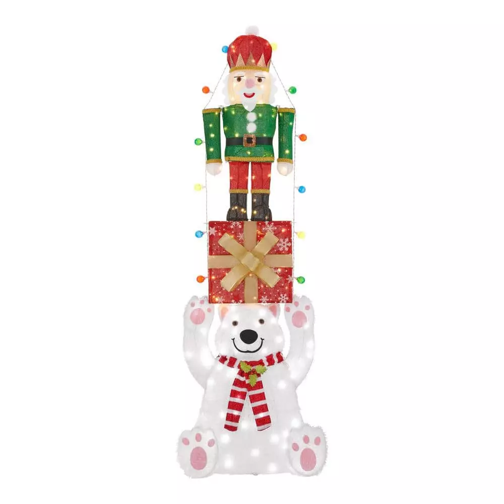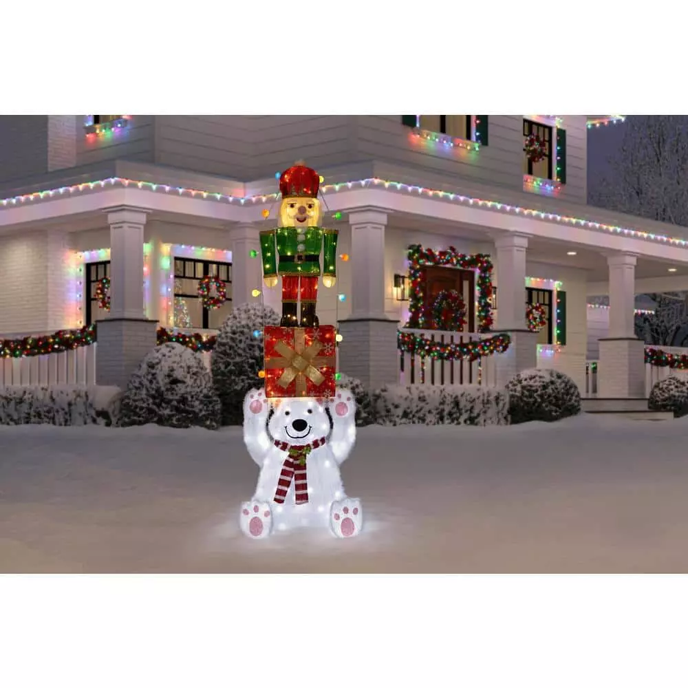 Match the merriment and festive spirit of your lawn’s decor with this LED stacked polar bear and nutcracker sculpture. Featuring a sturdy metal construction, this festive sculpture withstands regular use in outdoor areas, and the tinsel accent adds to the yuletide charm of this dynamic, cheerful duo. The polar bear showcases ursine beauty, and the nutcracker delivers classic holiday appeal while warding off evil spirits. This LED stacked polar bear and nutcracker sculpture boasts 160 LEDs, presenting a brightly lit scene that greets your visitors throughout the season.
