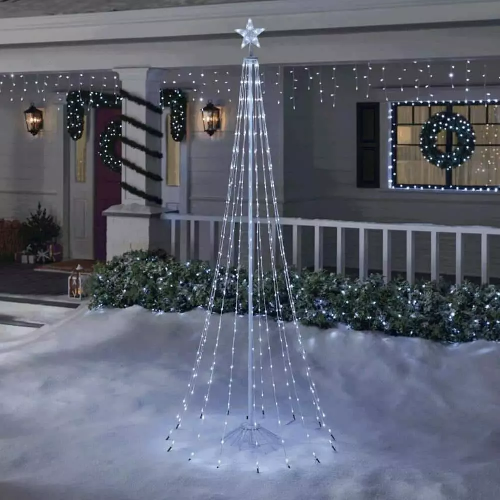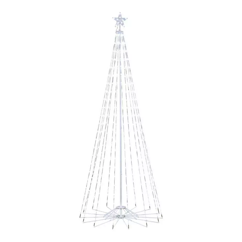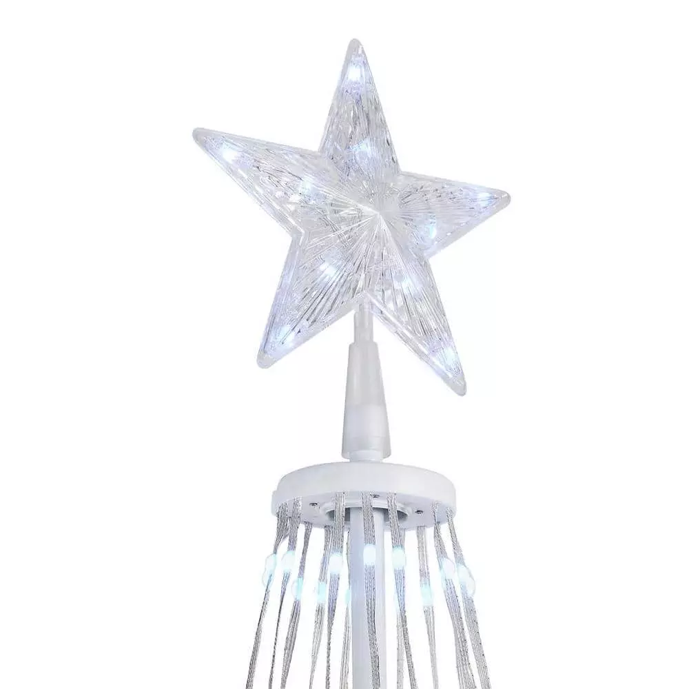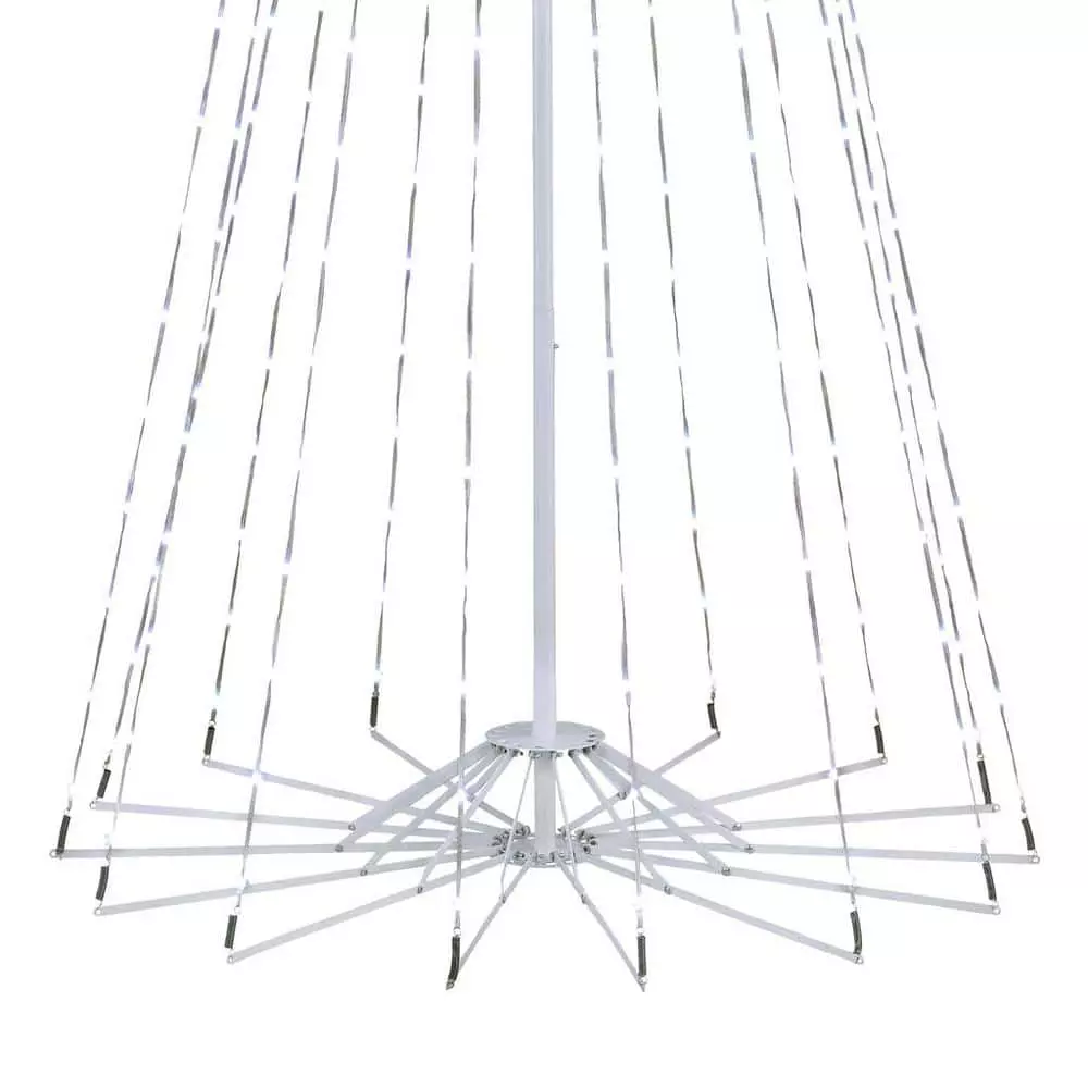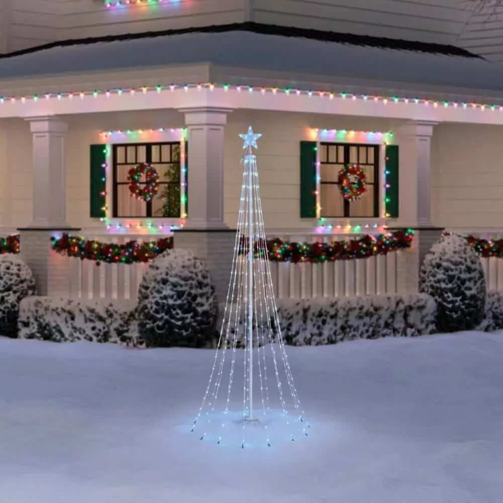 Set your yard apart from the neighbors with this spectacular 8 ft. Collapsible Lighted Cone Tree. 355 RGB muti-function lights creates your own outdoor light show. White metal frame with collapsible base and telescopic pole for easy assembly and storage after using. The cone tree includes a 10 light star that is synchronized with the other tree lights.
