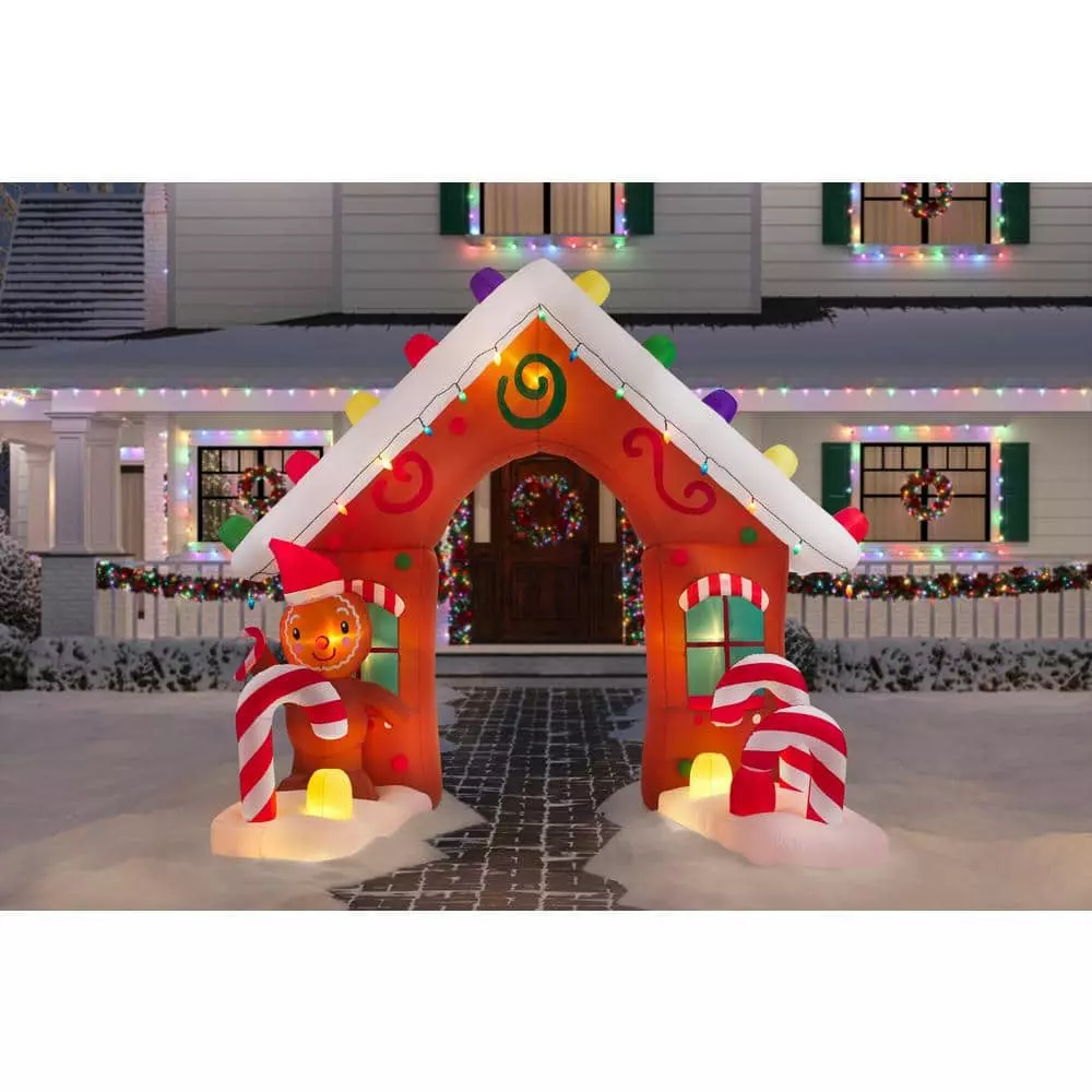 Candy-coat your Christmas celebrations with this Airblown gingerbread house archway inflatable. A cheery design featuring a lighted candy path welcomes visitors to your door, and the 8.4-foot height offers a perfect addition to your walkway or front porch. Energy-efficient LEDs create a brilliant glow to make your house stand out in the neighborhood. Use this archway as a decoration or as a backdrop for family photos. With a self-inflating design and included ground stakes and tethers, this Airblown gingerbread house archway inflatable supports simple setup.