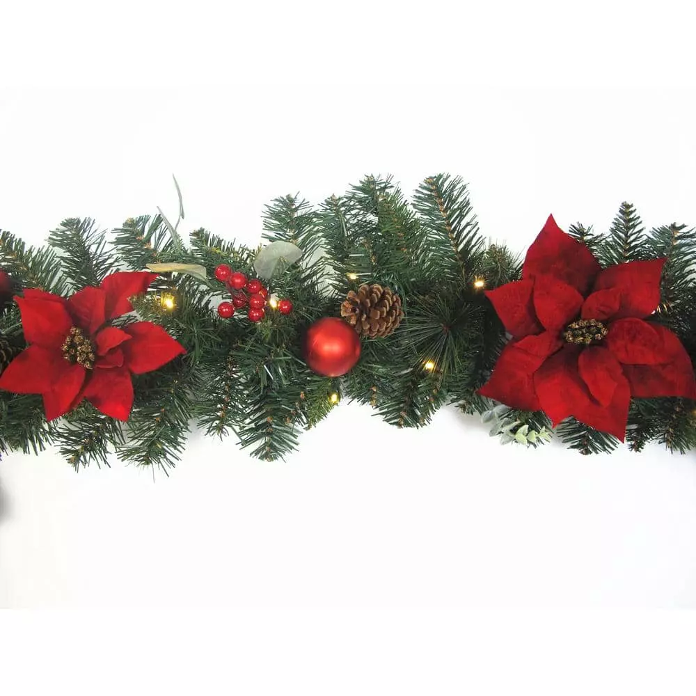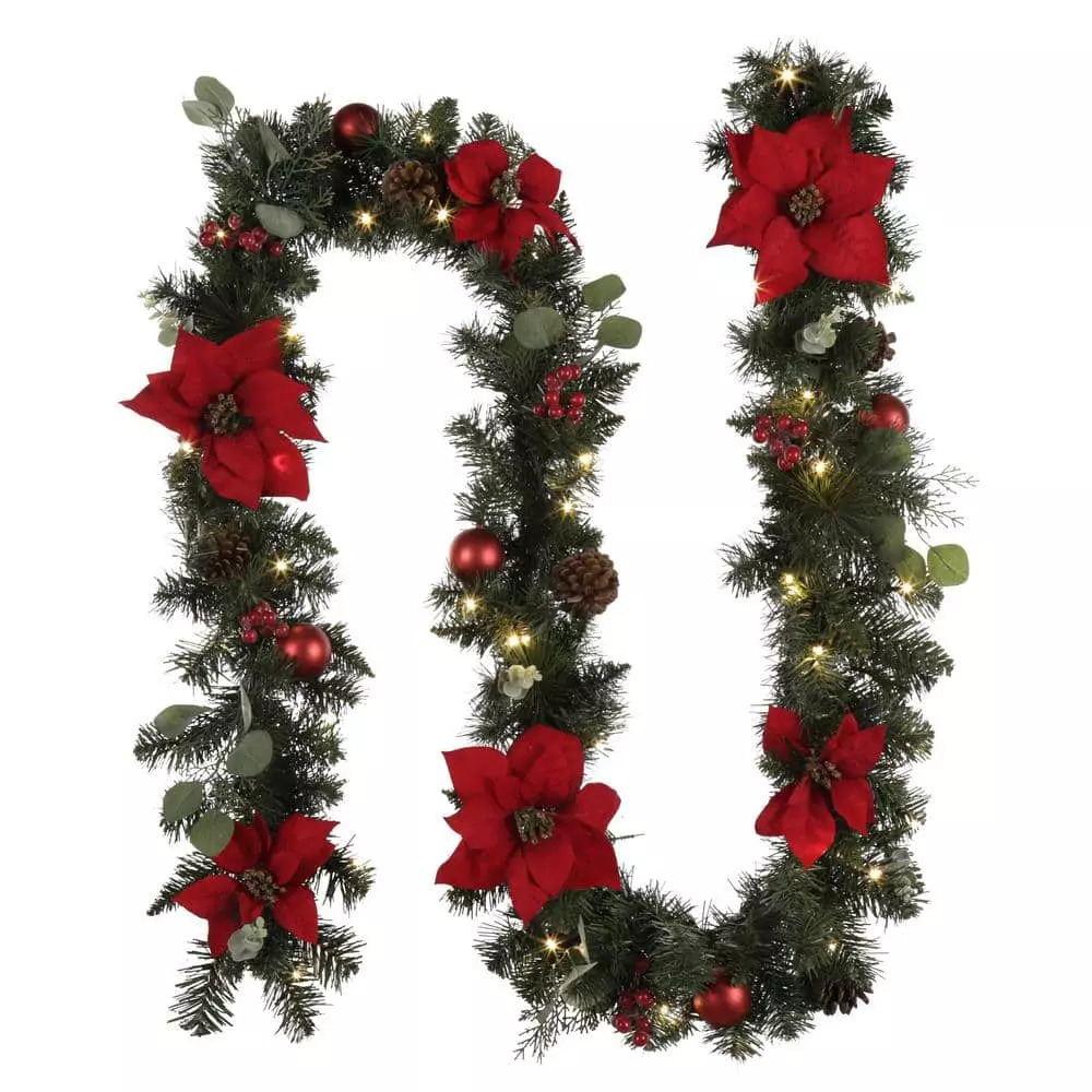Create a beautiful focal point on your mantel or entryway with this Berry Bliss artificial mixed pine Christmas garland. The 50 warm white LEDs brighten your hall or wall, setting a cheerful theme for the celebrations, while the timer-controlled on and off functions allow hassle-free operation. Adorned with colorful berries, poinsettias, ornaments and eucalyptus, this garland ushers in the holiday season with festive flair and charm. This Berry Bliss artificial mixed pine Christmas garland is battery-operated for versatile placement options.