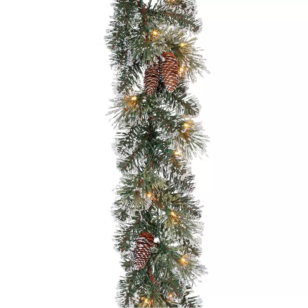 Beautify your home with this 9 ft Prelit Sparkling Amelia Garland. It features evergreen branches with pinecones. The 50 clear incandescent bulbs easily complement your other holiday decorations. Make your space perfect for capturing images and creating holiday memories.