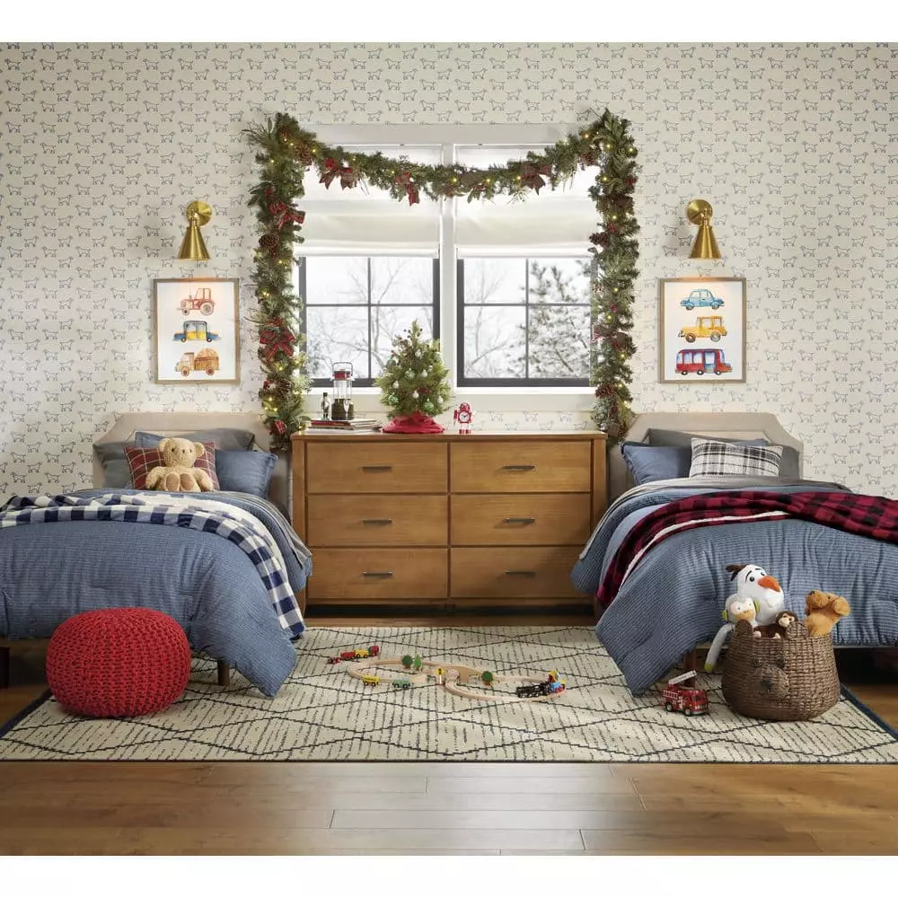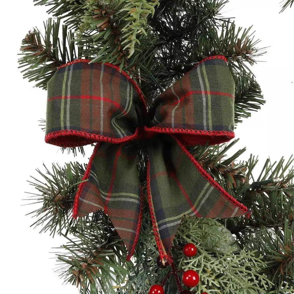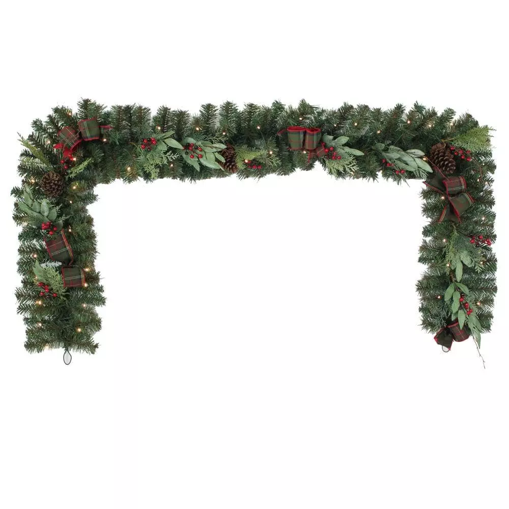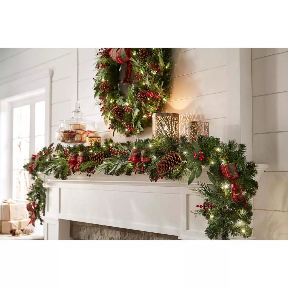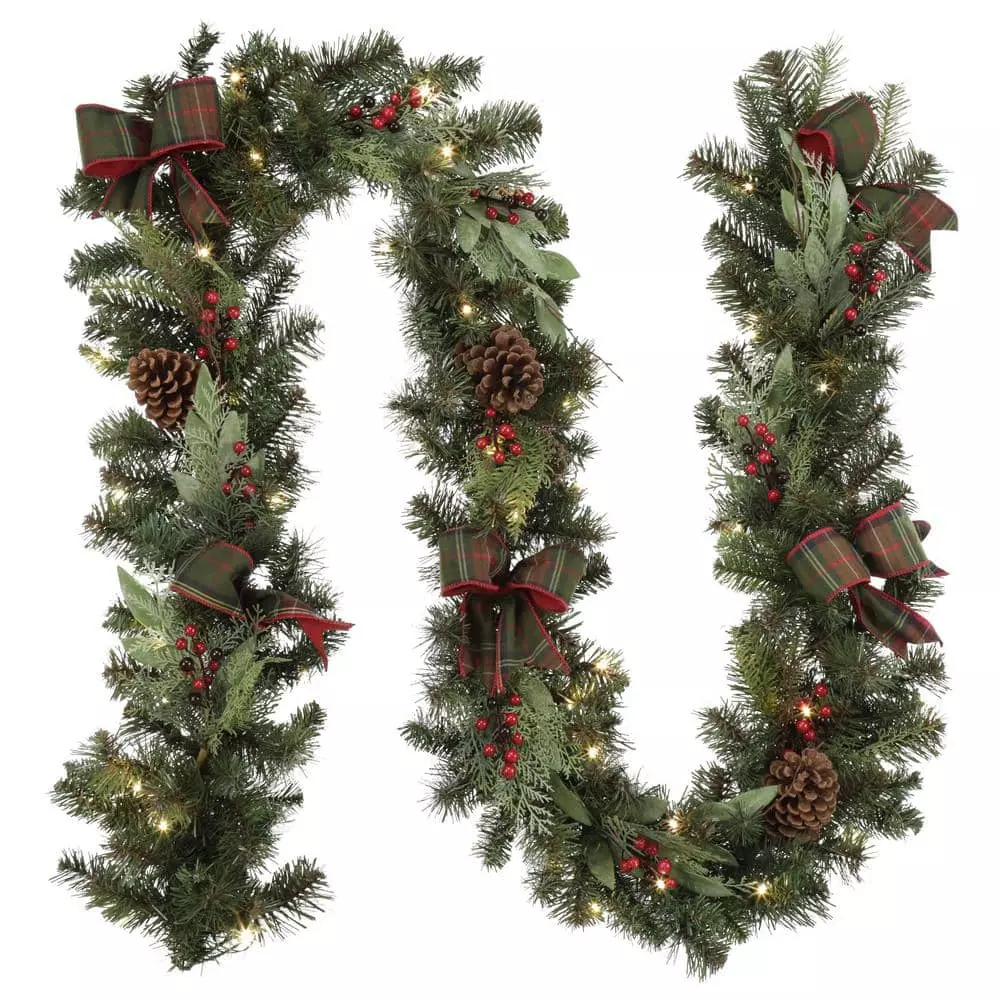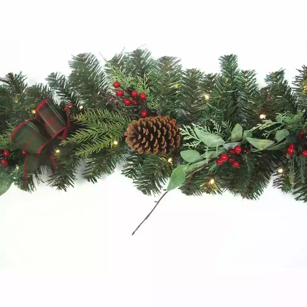Create a joyful, holiday scene with this Woodmoore pre-lit artificial Christmas garland. The built-in timer lets you automate the lighting schedule, and the 50 white LEDs cast a warm glow to create a cozy atmosphere for your guests. Featuring a battery-powered design, this pine garland offers decorative versatility in spaces without a handy outlet. Red berry, pine cone and plaid bow accents add festive appeal to this 9-foot Woodmoore pre-lit artificial Christmas garland, completing the look with classic yuletide flair and winter charm.